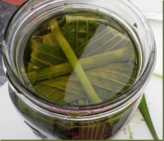 After all the plant matter is chopped and placed into the jar, it is covered with vinegar. I reserved some large plantain leaves and some jewelweed stems. The plant matter is carefully covered with the leaves, and then the stems are inserted in such a way as to hold everything below the surface. Be careful not to enclose air pockets under the leaves, though.